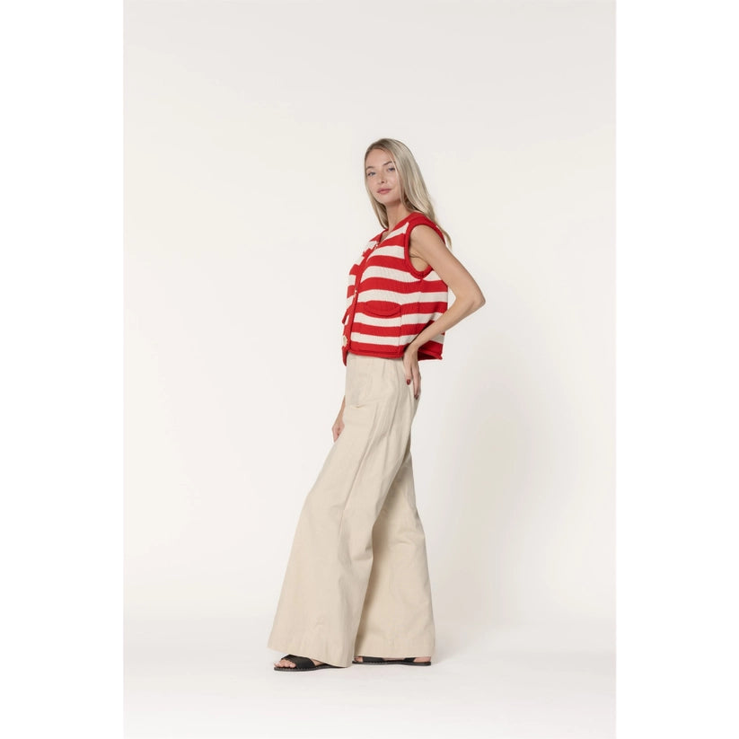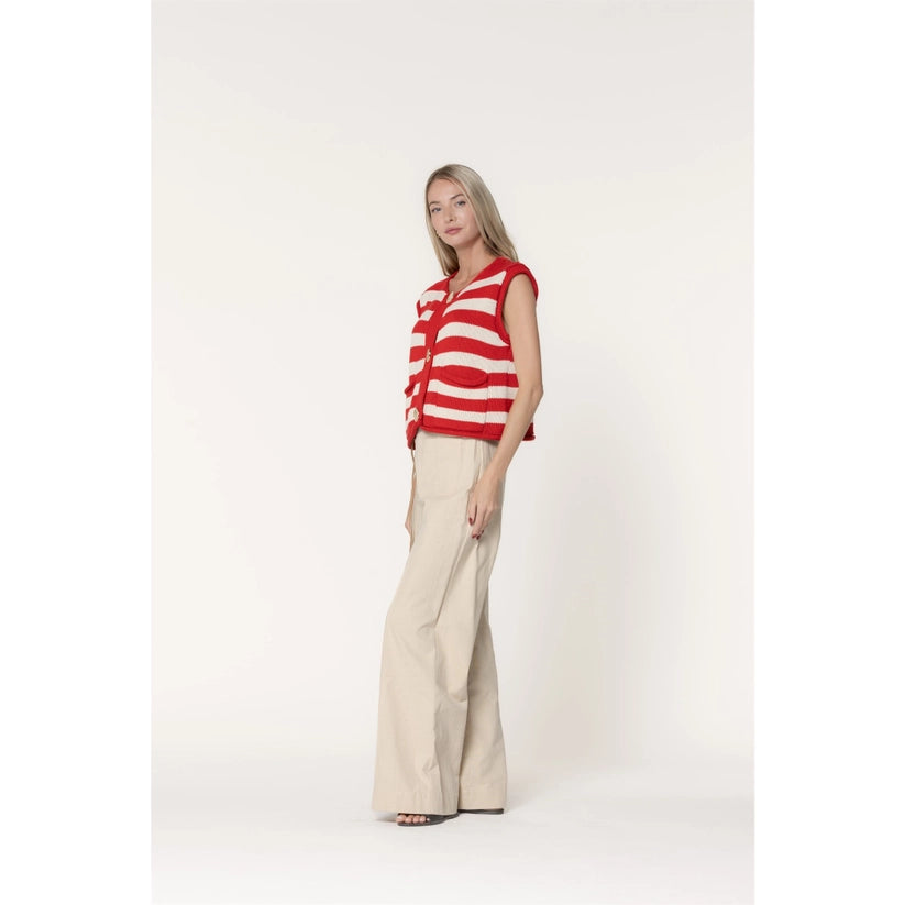 Layer up with this charming striped sweater vest featuring bold red and ivory stripes that instantly elevate any outfit. Oversized gold buttons add a touch of vintage-inspired glamour, making it perfect for pairing over your favorite tees or collared shirts. The relaxed fit keeps things comfy while the classic color combo works with practically everything in your wardrobe. Whether you're going for preppy chic or casual cool, this vest brings personality and polish to your everyday style.